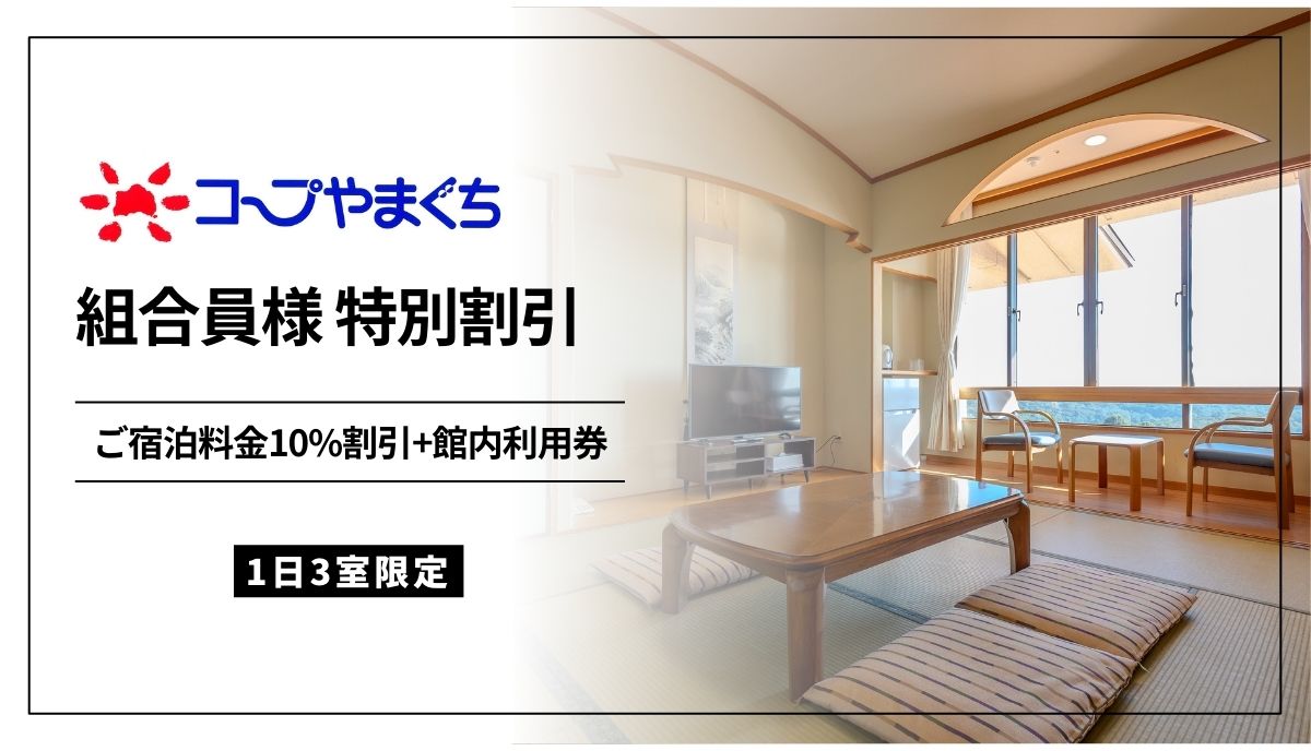 - 1グループ内にコープやまぐち組合員様お一人以上でご宿泊料金から10%割引(先着1日3室)
