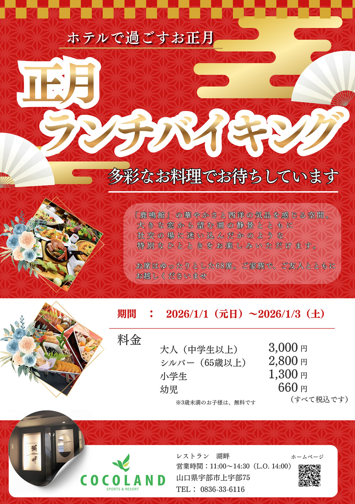 ホテルココランドでは、今年リニューアルした本館2階レストラン「湖畔」にて“正月ランチバイキング”を開催。